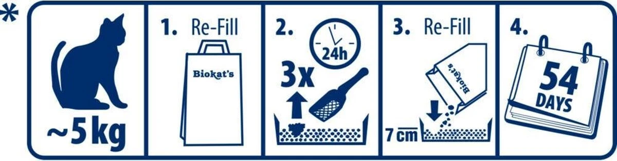 - BEWARING: Sluit de papieren zak en bewaar Biokat’s bentonietstrooisel steeds op een droge plaats