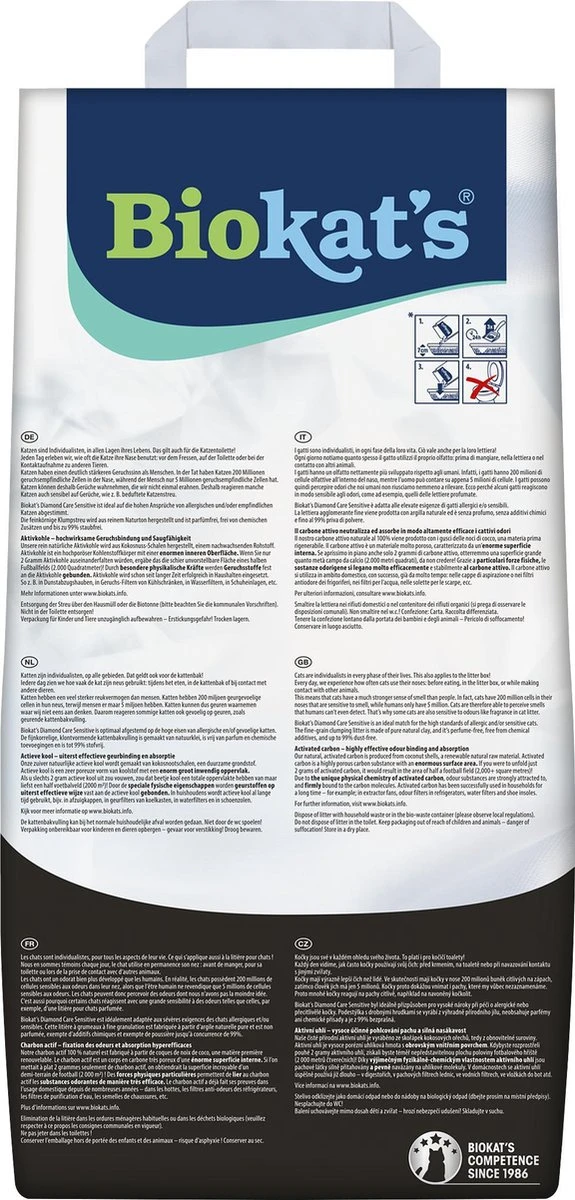Katten zijn individualisten, in alle levensomstandigheden. Ook wat betreft hun gebruik van de kattenbak! Elke dag maken we mee hoe vaak de kat zijn neus gebruikt: vóór het eten, op de bak en bij contact met andere dieren. Katten hebben een duidelijk sterkere reukzin dan mensen. Katten hebben dan ook 200 miljoen geurgevoelige cellen in hun neus, terwijl de mens het met 5 miljoen moet doen. Katten kunnen dan ook geuren waarnemen die wij mensen helemaal niet kennen. Veel katten reageren dan ook gevoelig op geuren zoals die wordt afgegeven door geparfumeerde kattenbakvulling. Biokat’s Diamond Care Sensitive is optimaal afgestemd op de hoge eisen die door allergische en/of gevoelige katten worden gesteld. De klontvormende fijne korrels worden van pure natuurklei gemaakt en zijn parfumvrij, vrij van chemische toevoegingen en tot wel 99% stofvrij. Actieve kool: zeer effectieve geurbinding en absorptie. Onze zuiver natuurlijke actieve kool wordt gewonnen uit kokosnoten, een hernieuwbare grondstof. Actieve kool is uiterst poreuze koolstof, met een zeer groot inwendig oppervlak. Uitgevouwen levert 2 gram actieve kool al een oppervlak op van maar liefst 2000 vierkante meter – dat is een half voetbalveld! Door de bijzondere fysische eigenschappen worden geurstoffen vast aan actieve kool gebonden. Actieve kool wordt al sinds lang met succes in de huishouding toegepast. Bijvoorbeeld in afzuigkappen, geurfilters van koelkasten, waterfilters, inlegzolen voor schoenen, enzovoort. Voer het strooisel met het huisvuil of het gft-afval af, in overeenkomst met de plaatselijke afvalvoorschriften. Spoel kattenbakvulling niet door de wc! Buiten het bereik van kinderen en dieren bewaren – gevaar voor verstikking! Droog bewaren.