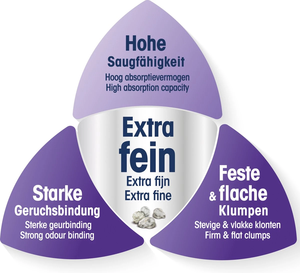 De natuurlijke kleisoorten die wij gebruiken, onderscheiden zich door een snel werkende en vooral langdurige geurbinding. Dankzij het zeer hoge absorptievermogen nemen de kleine korrels een veelvoud van hun eigen gewicht op en zorgen zo voor een extra lange gebruiksduur. De kattenbakvulling vormt vlakke en stevige klonten, die snel en eenvoudig kunnen worden verwijderd. Daardoor blijft de rest van de kattenbak lang schoon en fris.