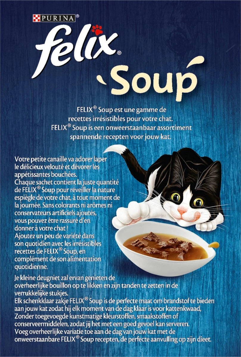 | Voedingsadvies | Voedingsadvies: Voor een kat van 4kg, giet in een kom en geef één portiezakje per dag, als aanvulling op andere volledige producten van Purina. Voor de gezondheid van jouw kat, respecteer het voedingsadvies.<br />Serveer op kamertemperatuur. Zorg ervoor dat er altijd schoon, vers drinkwater beschikbaar is. Dit product is een aanvullende maaltijd, met een hoog vochtgehalte: een gedeelte van de inname van de aanbevolen dagelijkse hoeveelheid water wordt door consumptie van dit product geleverd. |