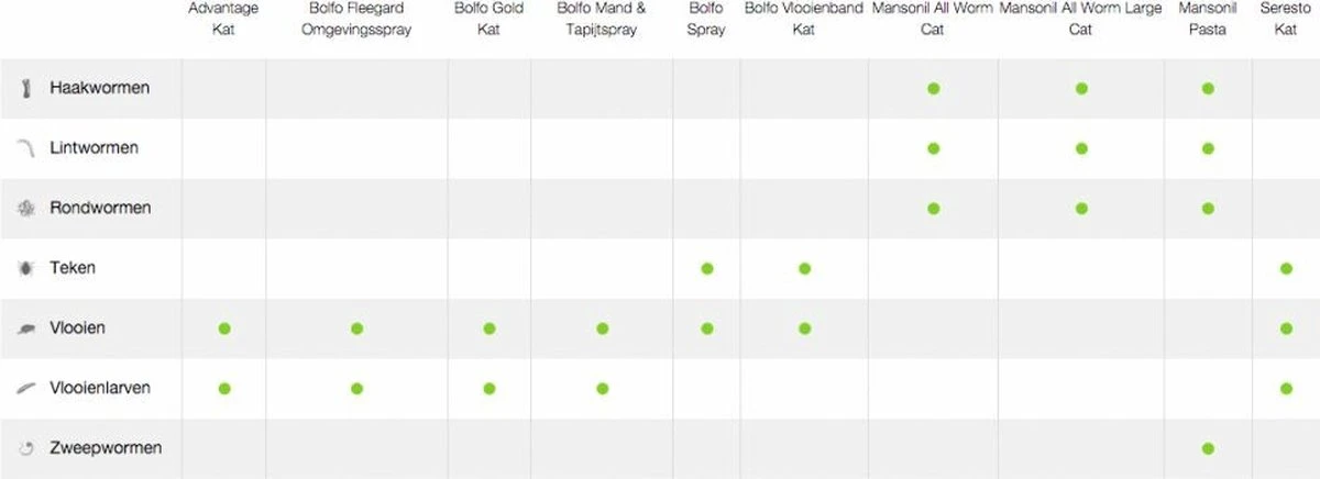 Wormen zijn een onzichtbare plaag en kunnen bij uw huisdier schade aanrichten. Ze laten zich pas zien als het dier ernstig besmet is. Wormenbesmettingen zijn ook overdraagbaar op mensen. Het frequent ontwormen is dus noodzakelijk voor de gezondheid van mens en dier. Ook omdat een herbesmetting met wormen zo is opgelopen is frequent ontwormen van belang. Mansonil All Worm is een middel dat een zeer breed spectrum aan wormen doodt. Mansonil All Worm doodt rondwormen en lintwormen. Dit is van belang daar wij met ons blote oog niet kunnen zien met welke worm het huisdier nu eigenlijk besmet is. Er zijn namelijk veel verschillende wormen. De behandelingen met Mansonil All Worm zijn eenmalig. U hoeft het dus niet na bijvoorbeeld een week wederom toe te dienen. Mansonil All Worm® Large Cat is een ontwormingsmiddel met een brede werking. Het doodt de belangrijkste rond- en lintwormen bij de kat met een éénmalige behandeling.Doodt spoelwormen, haakwormen en lintwormen, waaronder de vlooienlintworm en de vossenlintworm.