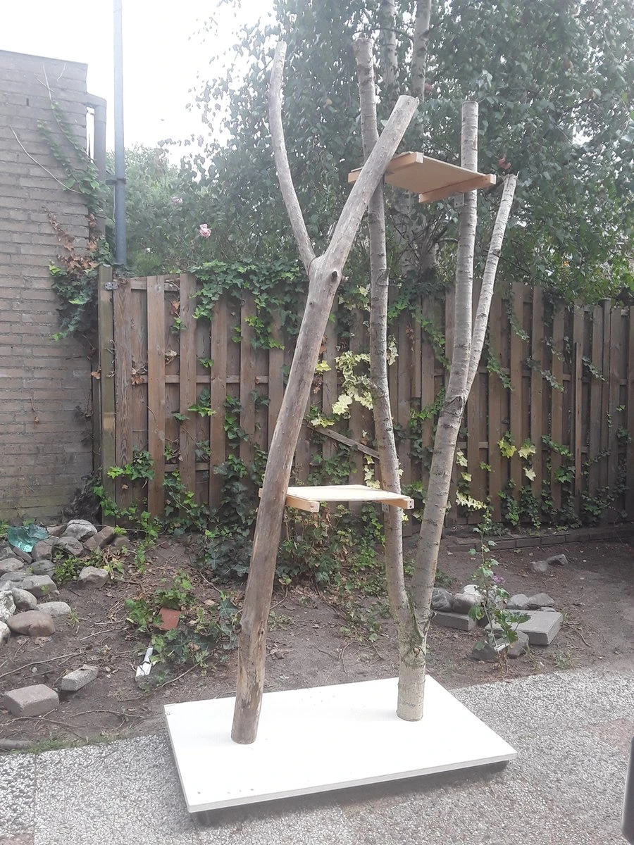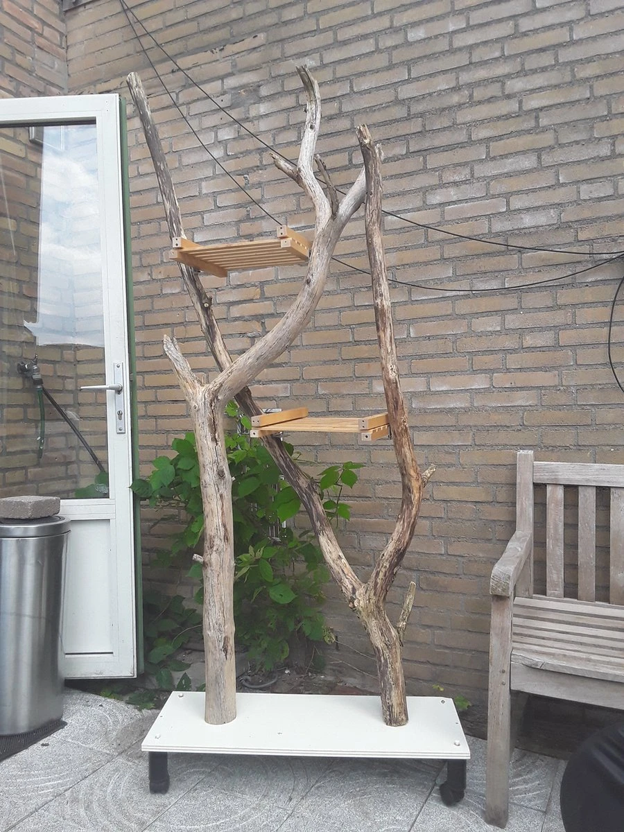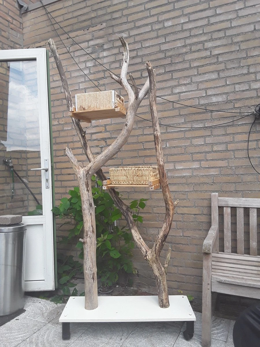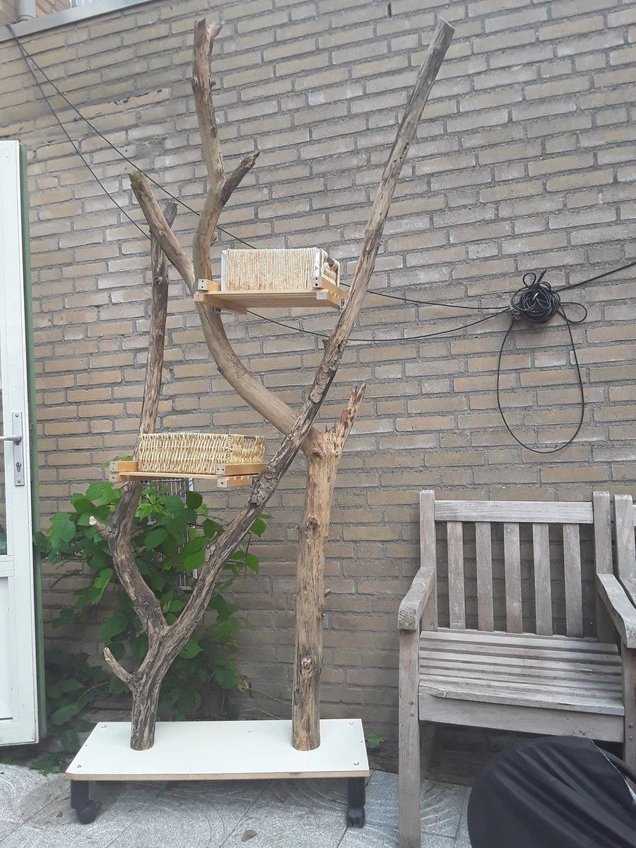 Natuurlijke hele mooie, met de hand gemaakte stevige krab-en klimboom. Gemaakt van echte boomtakken. Hij is verrijdbaar en heeft uitneembare mandjes waarin de katten lekker in kunnen chillen en relaxen. Katten kunnen hier heerlijk hen nagels inzetten.