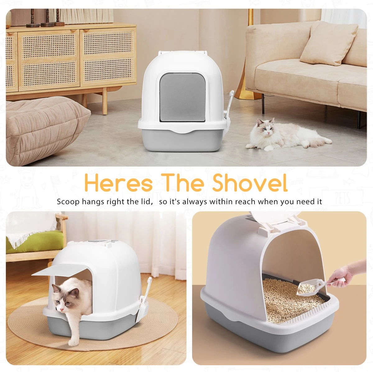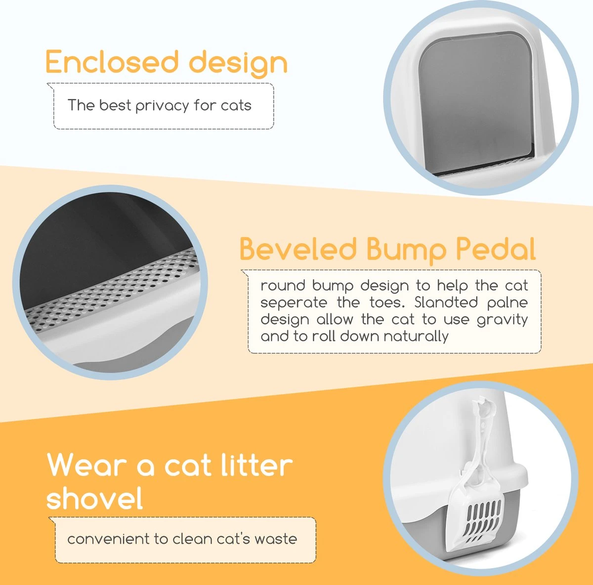 Katten kunnen in- en uitlopen via de toegangsopening aan de voorkant, en bij de in- en uitgang is een voetpedaal ontworpen om te voorkomen dat de kattenbakvulling door de pootjes van de kat wordt meegesleurd. Niet alleen dat, ons product wordt geleverd met een draagbare handgreep op de bovenste deksel, die het gemakkelijk maakt voor de eigenaar om de kattenbak te dragen.