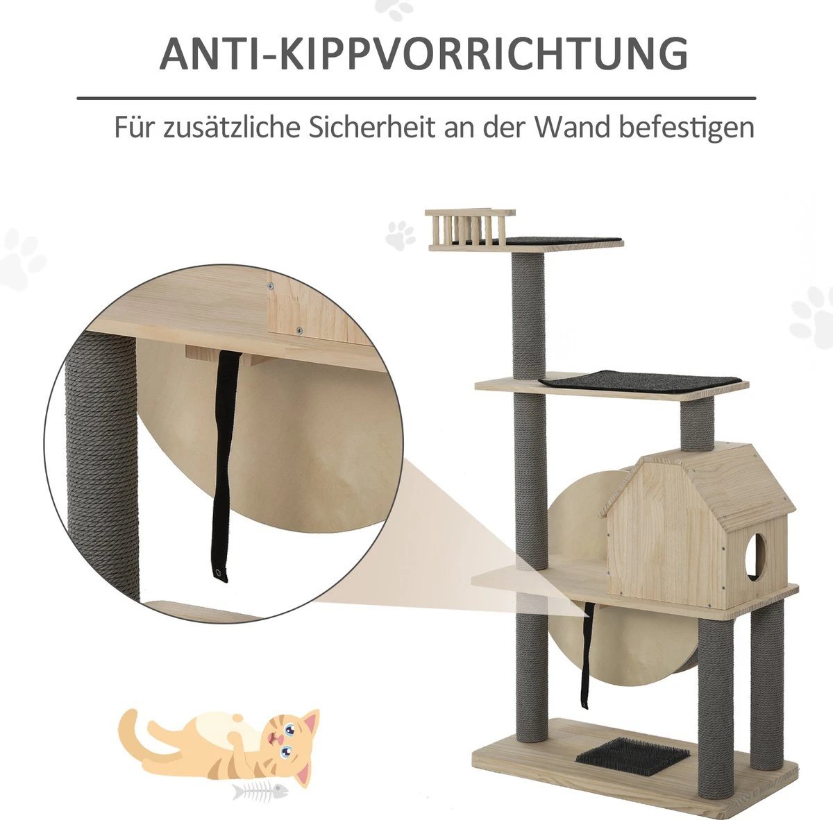 PawHut Kattenboom Met Loopwiel Krabpaal Met 4 Verdiepingen Kattenhuis Met Sisalpalen Massief Hout D30-303