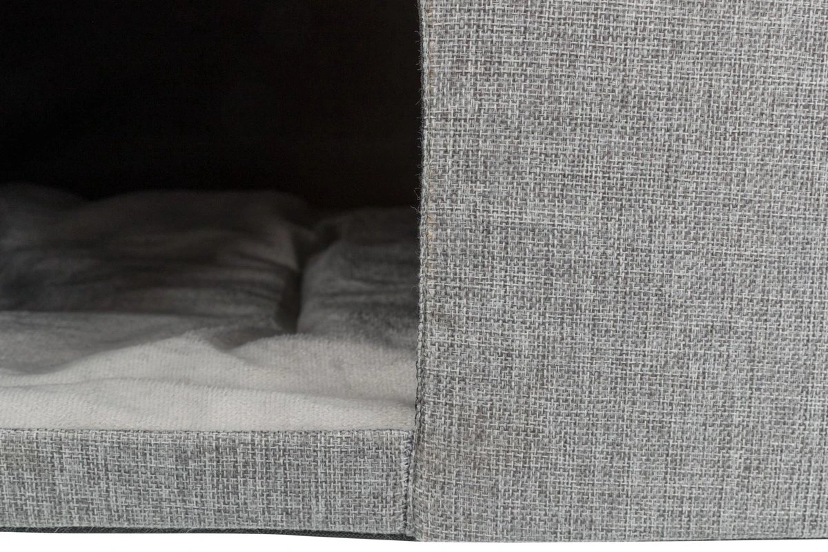 Het Trixie Kattenhuis Kimy Lichtgrijs van 72 x 40 x 40 cm is een leuk relax-huis voor binnen, met kussen en opbergvak. Het ideale eigen plekje voor jouw kat of kleine hond! Deze leuke Relax-Iglo is een rechthoekig huisje met aan één kant een ingang. Het huisje is gemaakt van geweven stof met een leuke afbeelding van het silhouet van een hond aan de zijkant. Het dak van de Iglo is afneembaar: hieronder vind je een opbergvak, waarin je bijvoorbeeld de favoriete speeltjes van jouw dier kunt opbergen. Ook kun je ervoor kiezen om het vak, dat vastzit met klittenband, eruit te halen om zo van bovenaf extra toegang te hebben tot de kat of hond. Het huisje komt met een heerlijk comfortabel, wendbaar kussen met pluche bekleding. Je kunt het kussen wassen in de wasmachine op 40 graden Celcius.
