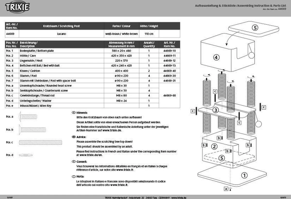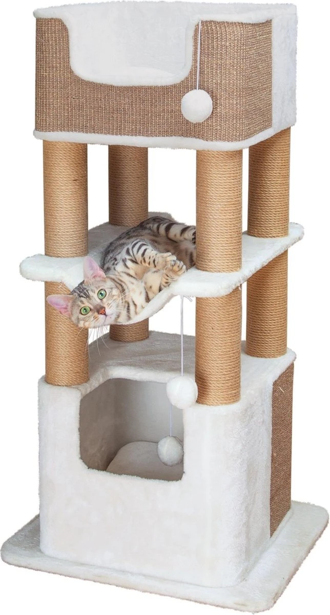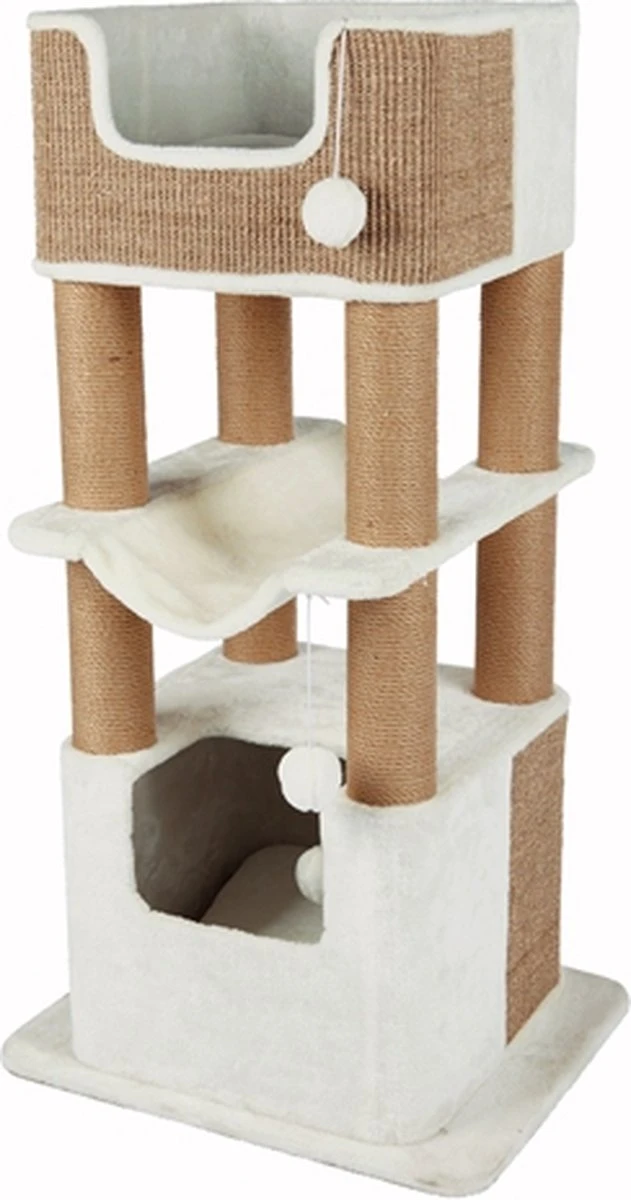 De Trixie Lucano Krabpaal Wit/Taupe 58X48X110 cm is een extra grote krabpaal geschikt voor grote katten, met twee schuilplaatsen en kussens en een ligmand. Ook grotere katten hebben voldoende plek op deze moderne krabpaal van Trixie. Krabpaal Lucano is een XXL krabpaal die ook geschikt is voor grotere kattenrassen als Maine Coons en boskatten. De krabpaal is uitgerust met extra grote schuilplaatsen die geheel bekleed zijn met pluche en voorzien zijn van comfortabele, wendbare kussens. Ook kan de kat in het midden plaatsnemen op het extra ligmandje. Krabben kan naar hartenlust aan de jute krabvlakken en de met jute beklede krabstammen. Tot slot zijn er enkele pluche balletjes aan de krabpaal bevestigd om mee te spelen.