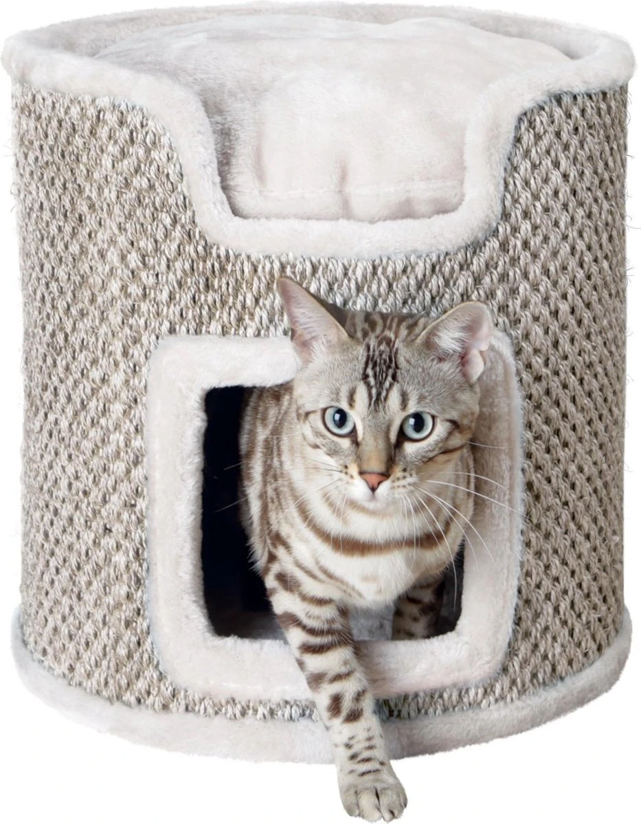 De Trixie Krabton Ria Krabpaal Lichtgrijs/Natuur van 39 x 37,5 x 39 cm is een ronde krabton voor de kat met sisal krabvlakken, schuilplaats, kussen en gevoerde ligplateaus. Een heerlijke eigen plek voor jouw kat hoeft niet te veel ruimte in te nemen, dat bewijst deze leuke krabton van Trixie. Krabton Ria is een compacte krabpaal voor de kat met twee verdiepingen. De ligplateaus zijn gevoerd voor meer comfort en het bijgeleverde wendbare kussen zorgt ervoor dat jouw kat heerlijk zacht kan wegdromen. De schuilplaats onderop is bekleed met lekker zacht pluche en fleece en aan de buitenkant is de ton bekleed met sisal, om jouw kat genoeg krabmogelijkheden te bieden. Krabben is een natuurlijke behoefte voor de kat, dus zorgt altijd voor voldoende mogelijkheden om te voorkomen dat jouw kat aan het meubilair begint!